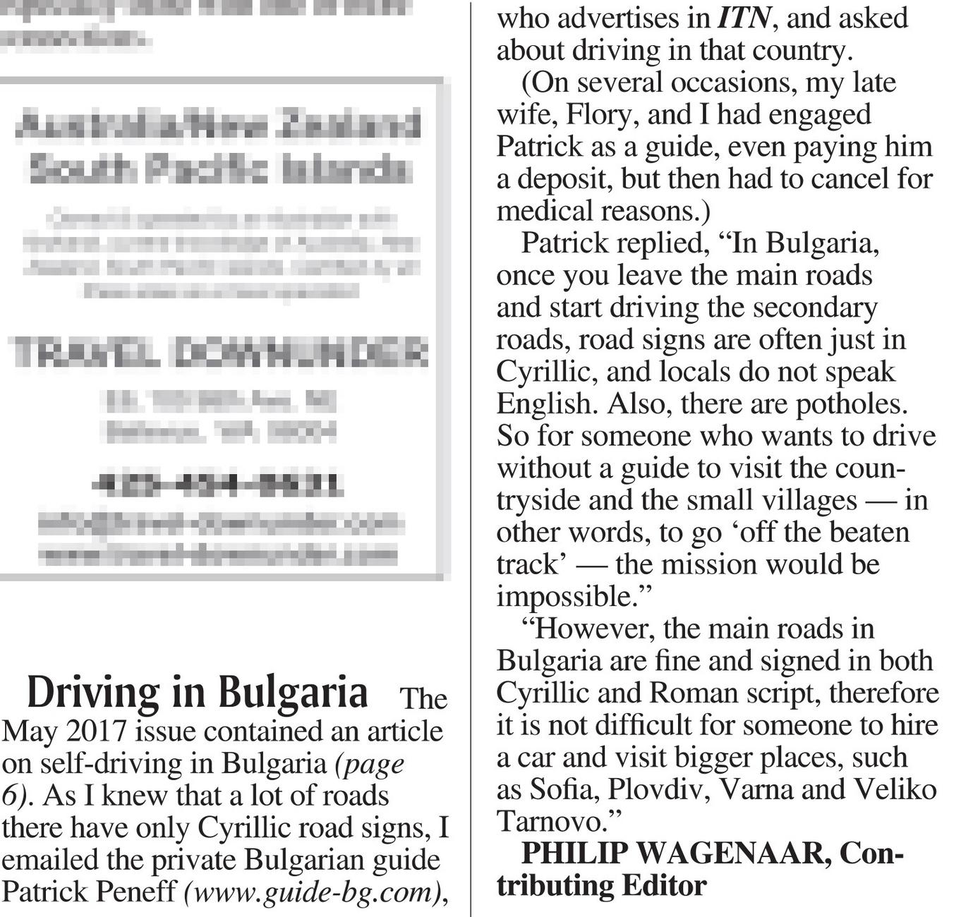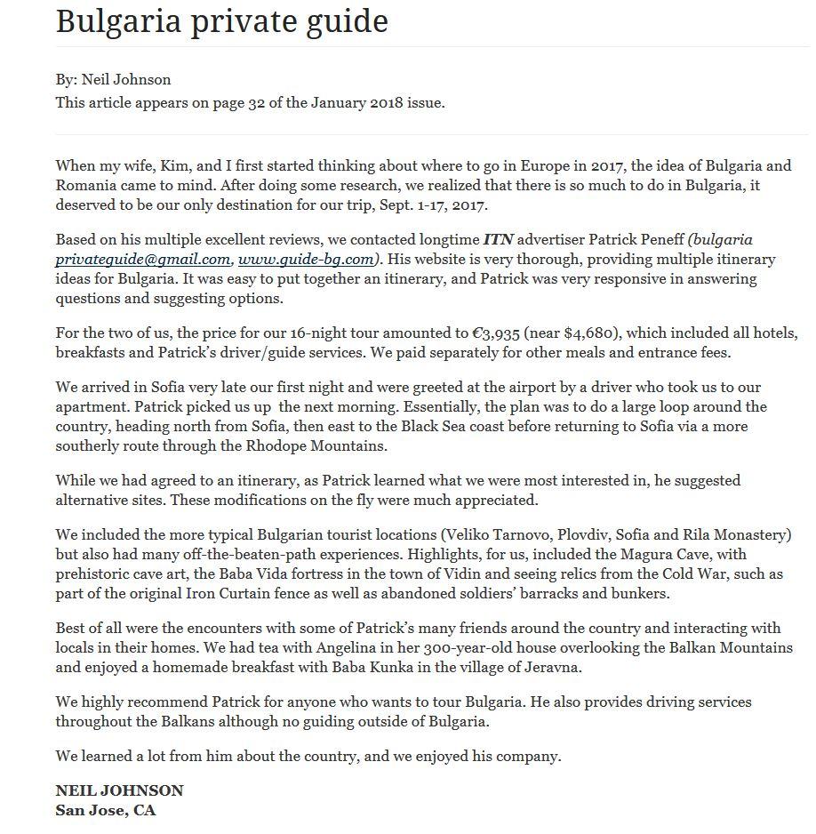 I am especially proud of the articles about my trips, published by my guests in the respectable and highly ranked International Travel News Magazine, USA